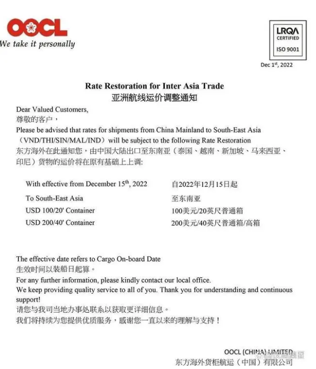 日前,東方海外OOCL發(fā)布通知稱,由中國大陸出口至東南亞(泰國、越南、新加坡、馬來西亞、印尼)貨物的運價將在原有基礎上上調(diào):自12月15日起至東南亞,20英尺普通箱上調(diào)100美元,40英尺普通箱/高箱上調(diào)200美元。生效時間以裝船日起算。具體通知如下: