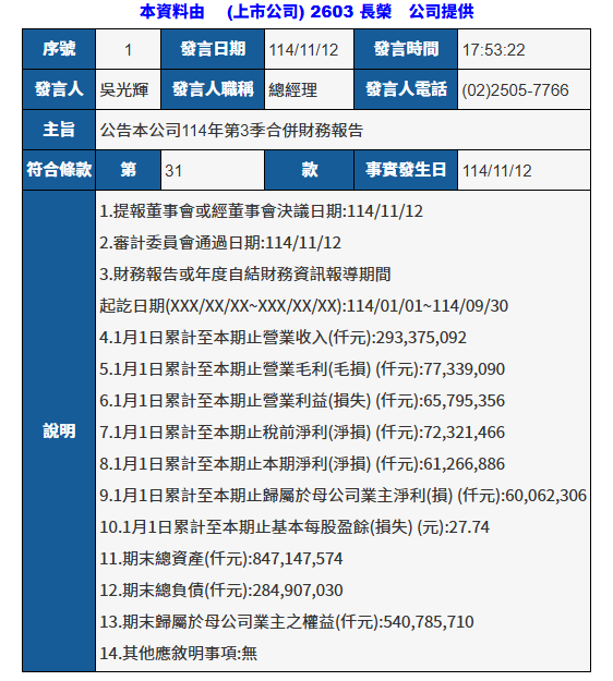 下圖為長(zhǎng)榮業(yè)績(jī)公告