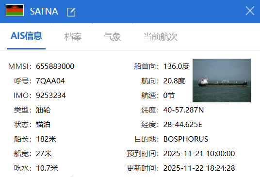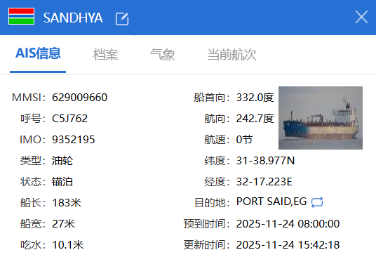 11月17日,懸掛岡比亞國旗的油輪“Sandhya”號裝載著約3萬噸柴油離開圖阿普謝港,駛向蘇伊士運(yùn)河。另一艘懸掛馬拉維國旗的油輪“Satna”號于11月18日在圖阿普謝碼頭裝載了約3萬噸柴油。