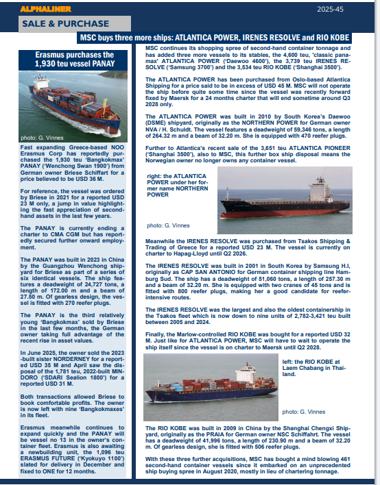 從疫情到目前,在全球班輪業(yè)的劇烈變動中,地中海航運(yùn)(MSC)正以前所未有的力度重塑全球運(yùn)力格局。最新一期 Alphaliner 報告顯示,MSC 再度買下三艘二手集裝箱船——ATLANTICA POWER、IRENES RESOLVE 和 RIO KOBE。這三艘船看似普通,卻再次將MSC的購船總數(shù)推向驚人的 461 艘,標(biāo)志著其自2020年以來持續(xù)進(jìn)行的大規(guī)模“鯨吞式擴(kuò)張”仍在高速推進(jìn)。