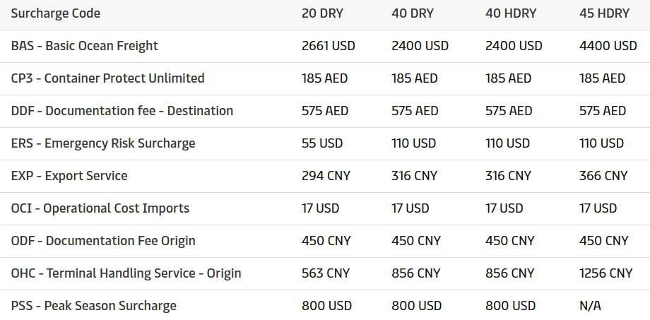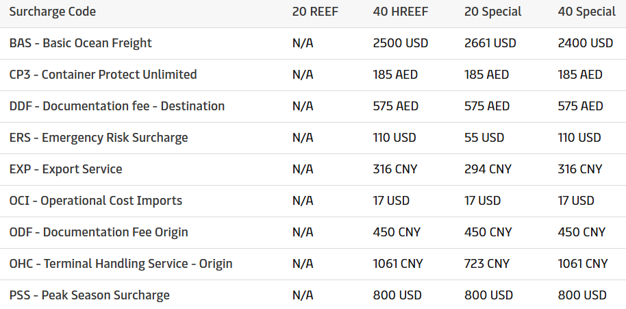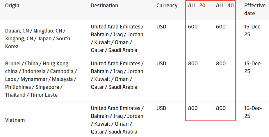 日前,馬士基和赫伯羅特紛紛宣布了最新旺季附加費(fèi)(PSS),自2025年12月15日起生效。1)馬士基將針對(duì)以下范圍征收PSS,直至另行通知,具體參照下表。金額如下:上海到迪拜杰貝阿里干貨集裝箱冷藏集裝箱和特殊集裝箱述費(fèi)率還適用于其他適用的附加費(fèi),包括地方費(fèi)用和應(yīng)急費(fèi)用。2)赫伯羅特亞洲和大洋洲*到幾內(nèi)亞科納克里港的PSS,詳細(xì)信息如下:金額:每標(biāo)準(zhǔn)箱2000美元(所有箱型)供您參考,本PSS的地理范圍如下解釋?zhuān)?/span>*亞洲和大洋洲:文萊、柬埔寨、中國(guó)、香港、印度尼西亞、日本、韓國(guó)、老撾、澳門(mén)、馬來(lái)西亞、緬甸、菲律賓、新加坡、臺(tái)灣、泰國(guó)、越南、澳大利亞、庫(kù)克群島、斐濟(jì)、密克羅尼西亞、新喀里多尼亞、新西蘭、法屬波利尼西亞、巴布亞新幾內(nèi)亞、所羅門(mén)群島、湯加、瓦努阿圖、留尼汪和富圖納群島海運(yùn)費(fèi)相關(guān)資訊海運(yùn)新聞4 月中歐班列時(shí)刻表擴(kuò)容至 17 條!月均班次近百,成海運(yùn)最佳替代方案2 分鐘閱讀海運(yùn)新聞全球海運(yùn)原油運(yùn)輸量大降約16%3 分鐘閱讀海運(yùn)新聞注意!“中國(guó)要求馬士基和地中海航運(yùn)停止在這兩個(gè)港口運(yùn)營(yíng)”2 分鐘閱讀
