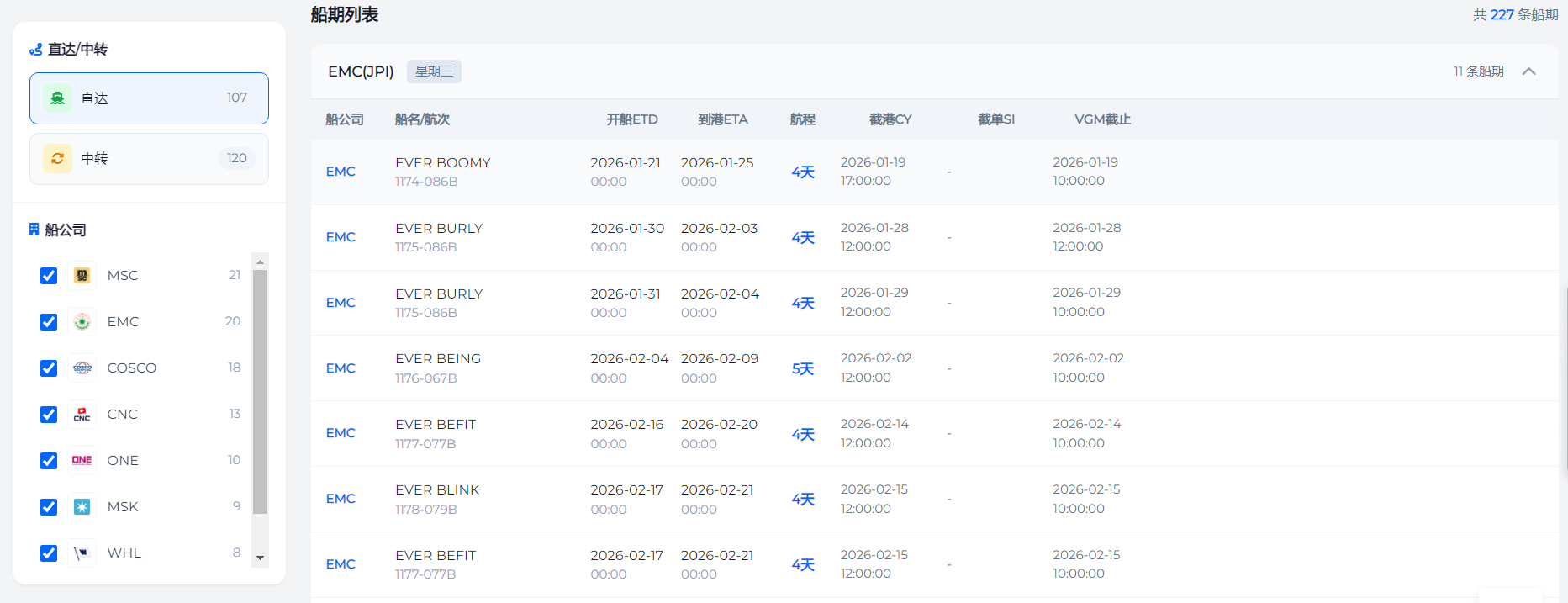- 使用篩選功能排序結(jié)果更高效。(航程排序,選擇最快船公司)可以按船公司、離港時(shí)間、航程時(shí)間等進(jìn)行排序和過(guò)濾,快速找到最合適的班次。