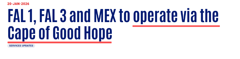 當?shù)貢r間1月20日,全球第三大集裝箱班輪公司--法國達飛突然發(fā)布公告稱:鑒于國際形勢復雜多變,達飛集團決定暫時將FAL 1 、 FAL 3 和 MEX航線上的船舶由紅海-蘇伊士運河改道經(jīng)由好望角航行!