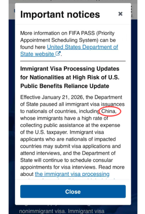 自2026年1月21日起,美國國務(wù)院暫停向包括中國在內(nèi)、其移民群體被認定為較高比例依賴美國公共福利、損害美國納稅人利益的國家國民簽發(fā)移民簽證。