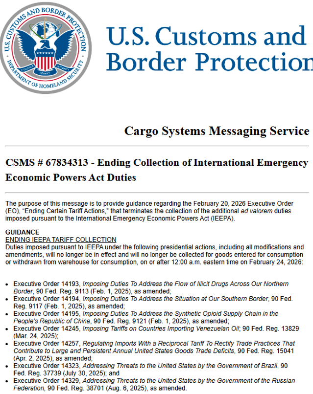 當(dāng)?shù)貢r間2026年2月22日晚,美國海關(guān)與邊境保護(hù)局(CBP)正式發(fā)布CSMS #67834313公告,確認(rèn)自2026年2月24日美國東部時間凌晨0點起,終止依據(jù)《國際緊急經(jīng)濟(jì)權(quán)力法》(IEEPA)加征的額外從價關(guān)稅。該決定意味著此前圍繞“芬太尼關(guān)稅”及“對等關(guān)稅”等一系列緊急關(guān)稅措施正式停止執(zhí)行。