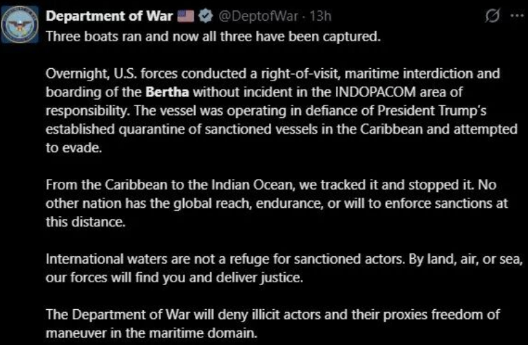美國國防部在X平臺發(fā)帖稱,美軍于夜間登上“Bertha”號超大型油輪(VLCC),實施了“登船臨檢、海上攔截”行動。該帖文稱:“該船無視特朗普總統(tǒng)對加勒比海受制裁船只的隔離令,試圖逃逸。我們一路追蹤,從加勒比海到印度洋,將其截停。”