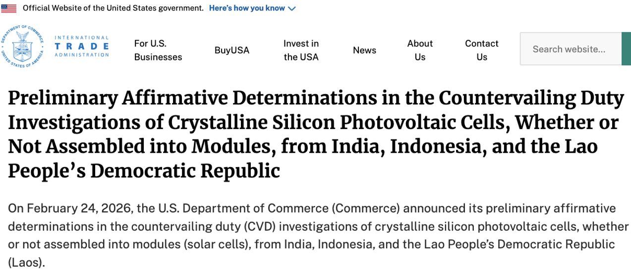 2026年2月24日,美國商務部宣布,對來自印度、印尼和老撾的晶體硅光伏電池(無論是否組裝成組件,即太陽能電池/面板)作出初步肯定性反補貼稅裁定,將征收關稅。
