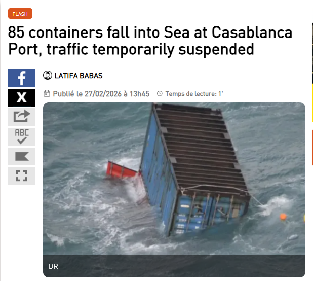 綜合多方一致信息顯示,此次事故涉及一艘懸掛利比里亞旗的集裝箱船“IONIKOS”輪。2月25日 2345,該輪在卡薩布蘭卡港完成卸貨作業(yè)后離港前往西班牙,事故發(fā)生在港口外海通道與港口入口一帶,初步判斷與當(dāng)時海況惡劣、涌浪沖擊有關(guān)。