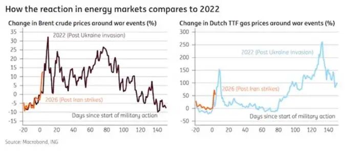 歐洲石油及部分LNG高度依賴進(jìn)口,能源價格飆升及供應(yīng)中斷風(fēng)險,或令2021至2023年能源成本危機(jī)情景重演。相較當(dāng)時,現(xiàn)狀有二大異點:歐洲無須再行“擺脫單一主要供應(yīng)商依賴”之舉,且油價危機(jī)發(fā)于冬末而非年初。歐元區(qū)政府能否(且愿否)通過新財政支持迅速彌補(bǔ)購買力損失,尚不明朗,財政壓力較2022年更甚。