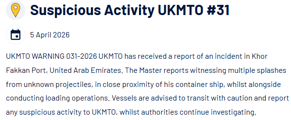 當(dāng)?shù)貢r(shí)間4月5日,英國(guó)海上貿(mào)易行動(dòng)辦公室(UKMTO)發(fā)布警告稱,一艘集裝箱船在阿聯(lián)酋豪爾費(fèi)坎港(Khor Fakkan Port)裝貨作業(yè)期間,船長(zhǎng)目擊多枚不明彈體在船舶近距離范圍內(nèi)濺落水面。