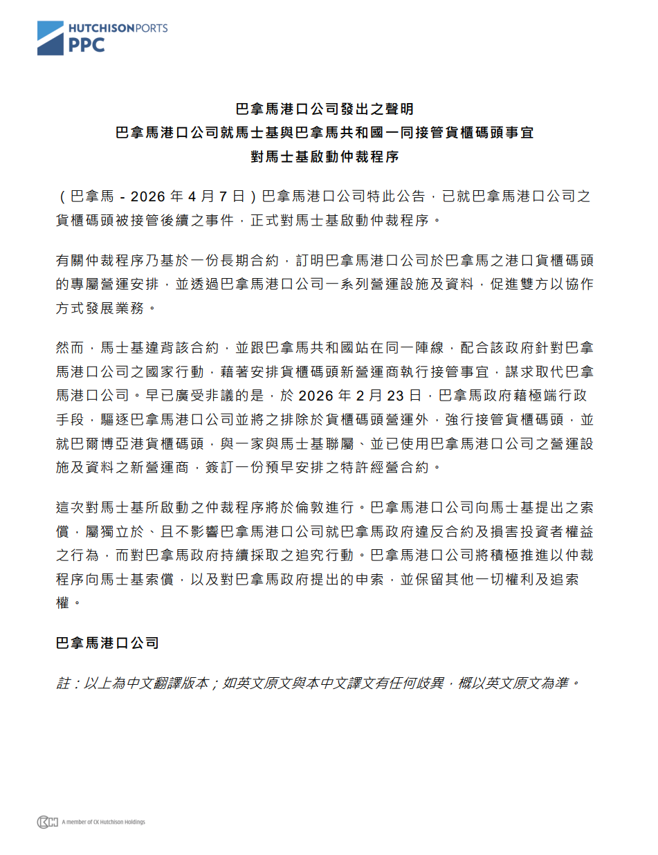 長(zhǎng)和旗下巴拿馬港口公司正式發(fā)布聲明,宣布就巴拿馬港口貨柜碼頭被接管的后續(xù)事宜,依據(jù)雙方長(zhǎng)期合作合約對(duì)馬士基集團(tuán)啟動(dòng)仲裁程序,本次仲裁將在倫敦進(jìn)行,這也是該公司繼向巴拿馬政府追責(zé)之后,針對(duì)此次港口經(jīng)營(yíng)權(quán)爭(zhēng)議采取的又一關(guān)鍵法律行動(dòng)。