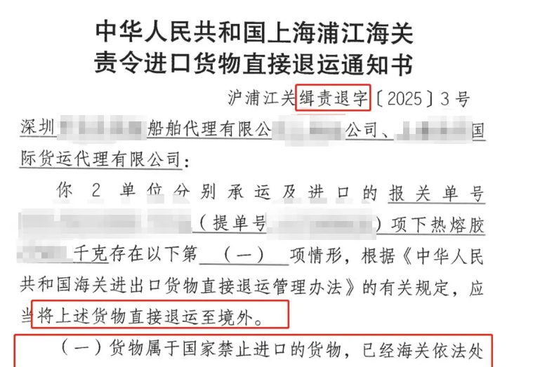 上海貨代A公司受客戶委托,通過馬來西亞貨代B公司從馬來西亞進(jìn)口1×40尺冷藏柜(提單顯示品名為“熱熔膠”,HS編碼3506990000)。首柜到港后,上海海關(guān)查驗(yàn)發(fā)現(xiàn)貨物屬于國家禁止進(jìn)口的貨物,實(shí)際貨物與申報(bào)不符。海關(guān)緝私部門介入調(diào)查,隨即對(duì)主單收貨人上海貨代A及深圳某船舶代理上海分公司下達(dá)退運(yùn)通知書。