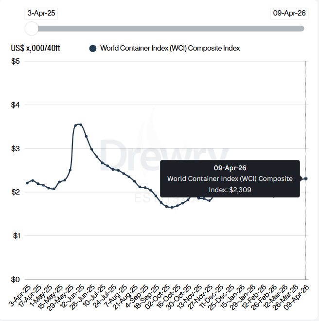 德路里WCI最新一期(4月9日)報2309美元/FEU,環(huán)比漲1%。漲幅不大,但分航線看,差異非常明顯:一邊漲勢兇猛,一邊降溫明顯。